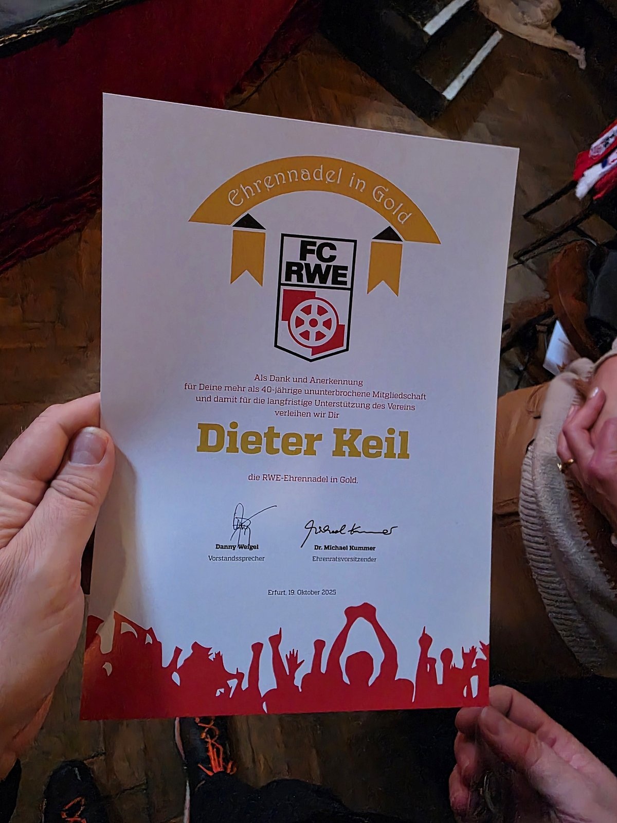 Auch zwei Männer, ohne die Rot-Weiß heute deutlich anders dastünde, wurden gewürdigt: Olaf Schwertner, für seinen großzügigen Verkauf wichtiger Medaillen und Urkunden an Rot-Weiß, und Kurt Gaida, der die von ihm vor der Entsorgung geretteten Pokale und Urkunden an RWE übergab.